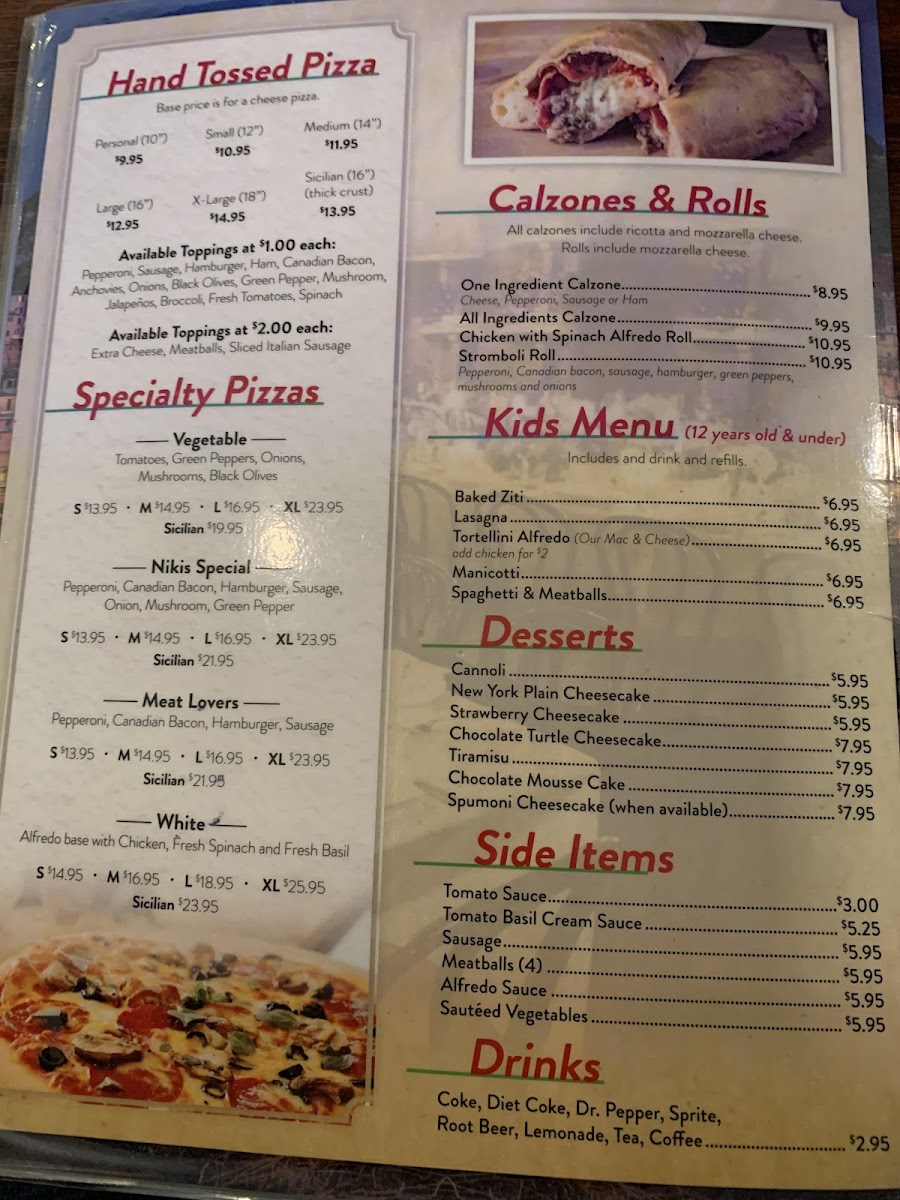 Available toppings: Pepperoni, sausage, hamburger, ham, canadian bacon, anchovies, onions, black olives, green pepper, mushroom, jalapeños, broccoli, fresh tomatoes, spinach, extra cheese, meatballs, sliced italian sausage.